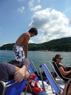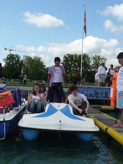 With Eszter we joined to the group a little bit later...(hmm..why? Because we couldn't find her passport... and why? ööö...because of me...because, last time ,when we wentto Yvoire, I left my passport at home...and I was worried, so we went back for it, which means that we lost half an our from our very important schedule...and I didn1t want to experience the same again..so for security reason, I took her passport too...) Anyways...so, after we arrived, we rented a pedal boat, than cycled in the lake...The only problem was, when a huge boat came in fornt of us...generating huge waves...yes..that was scary a little bit... NOOOOT... rather funny... but later, when I realized that my camera was in the water...well...that wsa not that funny....